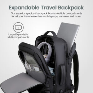 0.00$Travel Backpack with large expandable compartments, PU waterproof material, USB port, and multi compartments.