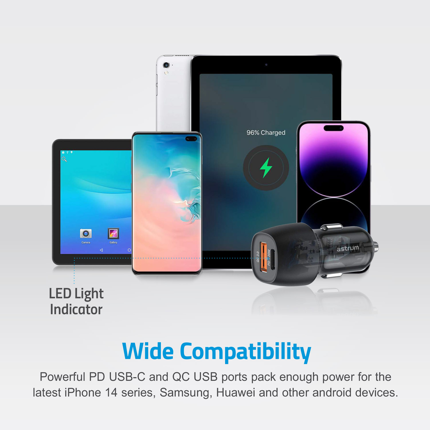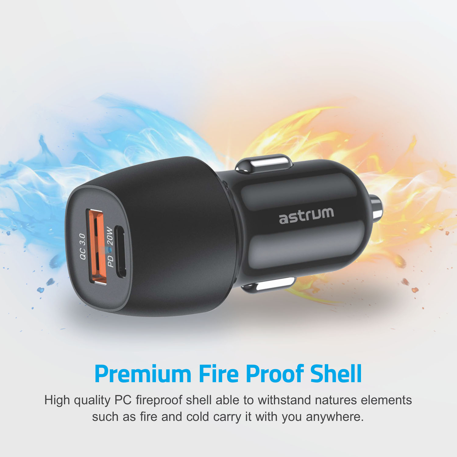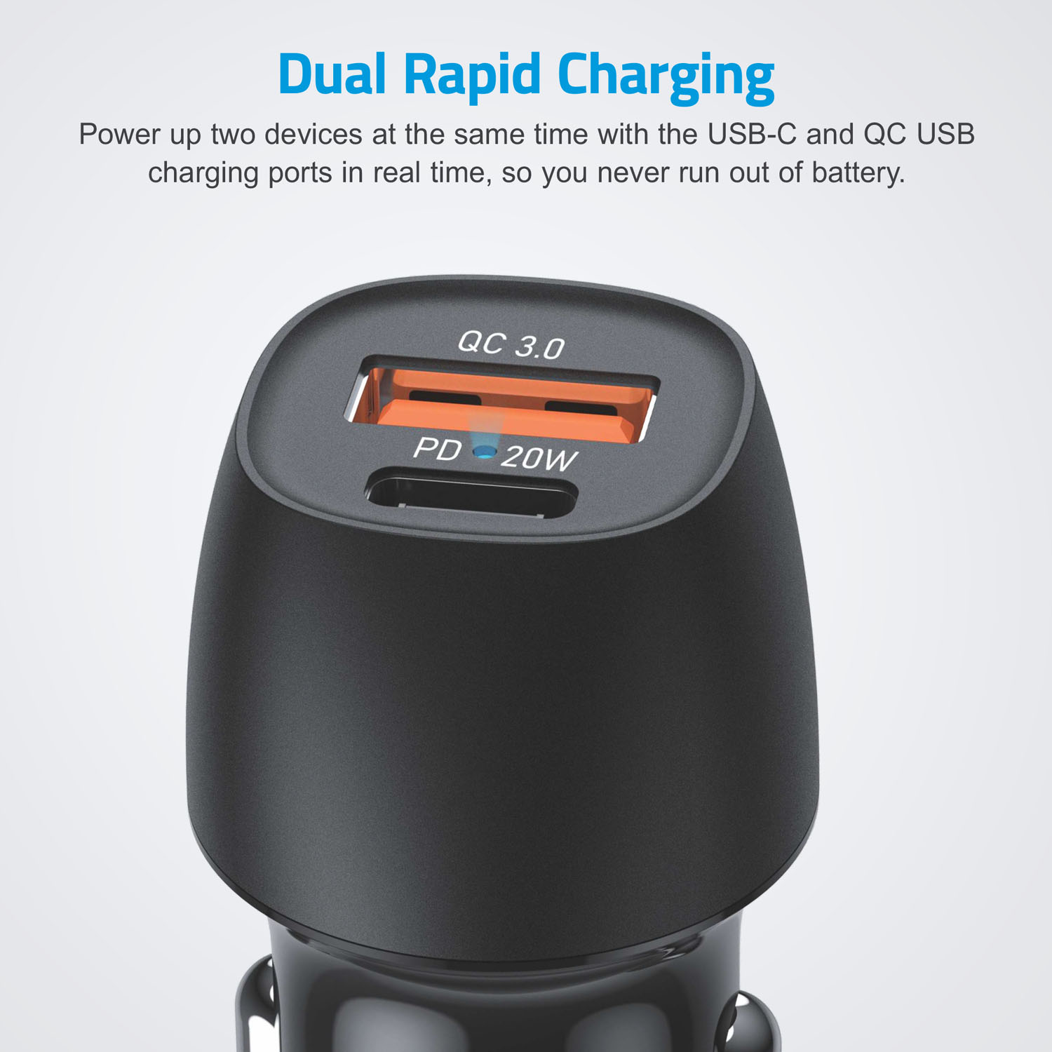 Ultra-fast travel car charger, quick charge PD 20W 3A USB-C, 18W USB-A output ports, and inbuilt smart IC.