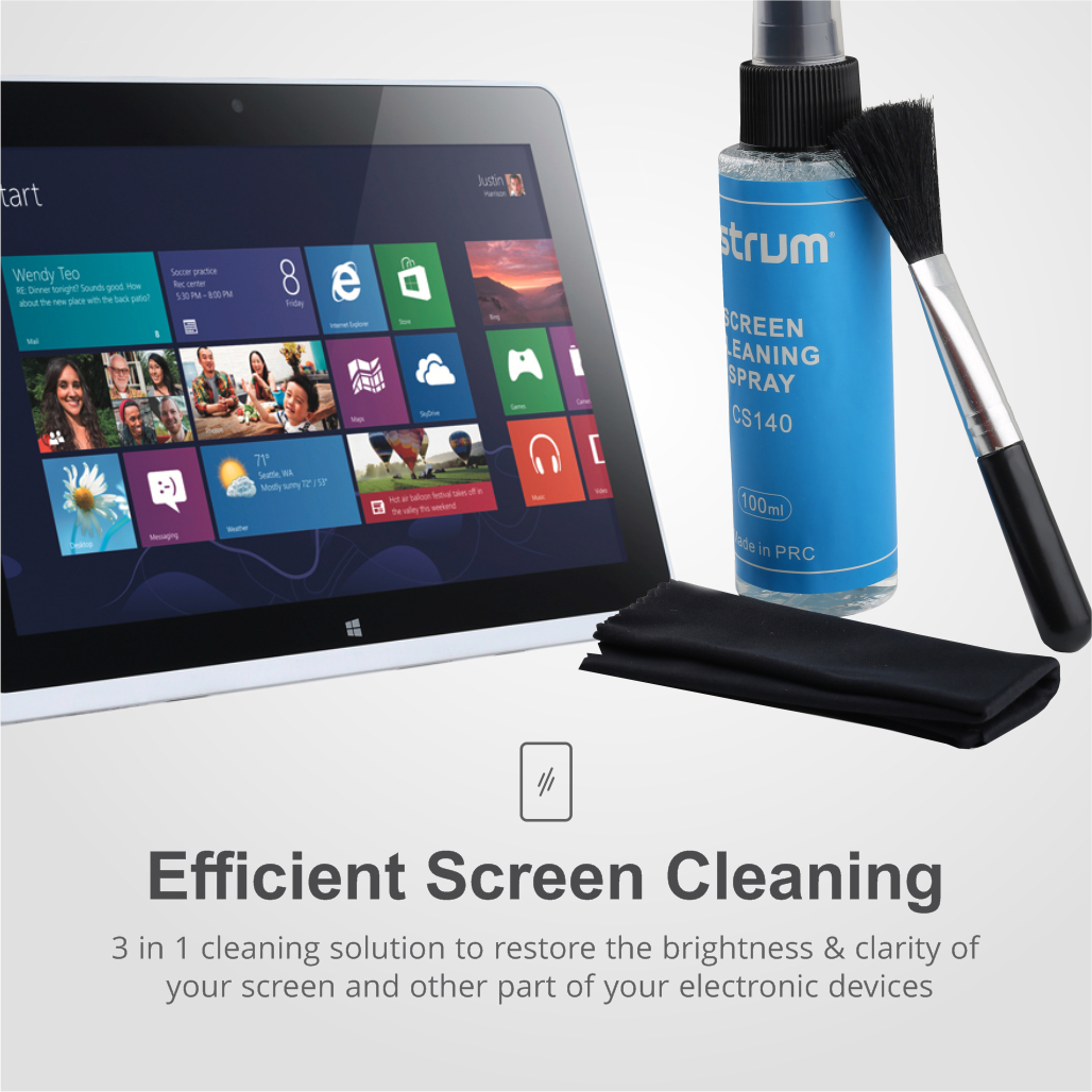 Astrum CS140 3 in 1 Cleaning Kit with Multipurpose Cleaning Spray, Microfiber Cloth, and Soft Brush designed to clean external areas on electronic devices and won’t cause damages, scratches to screens or surfaces