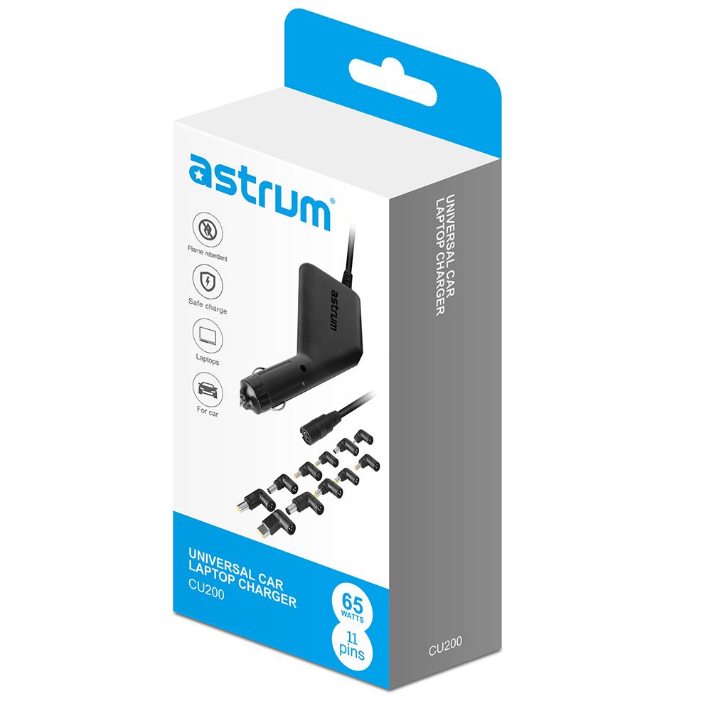 Efficient universal DC Car Laptop Charger, 65W, 11 DC plugs for most laptops, smart IC and fluctuation absorption technology.