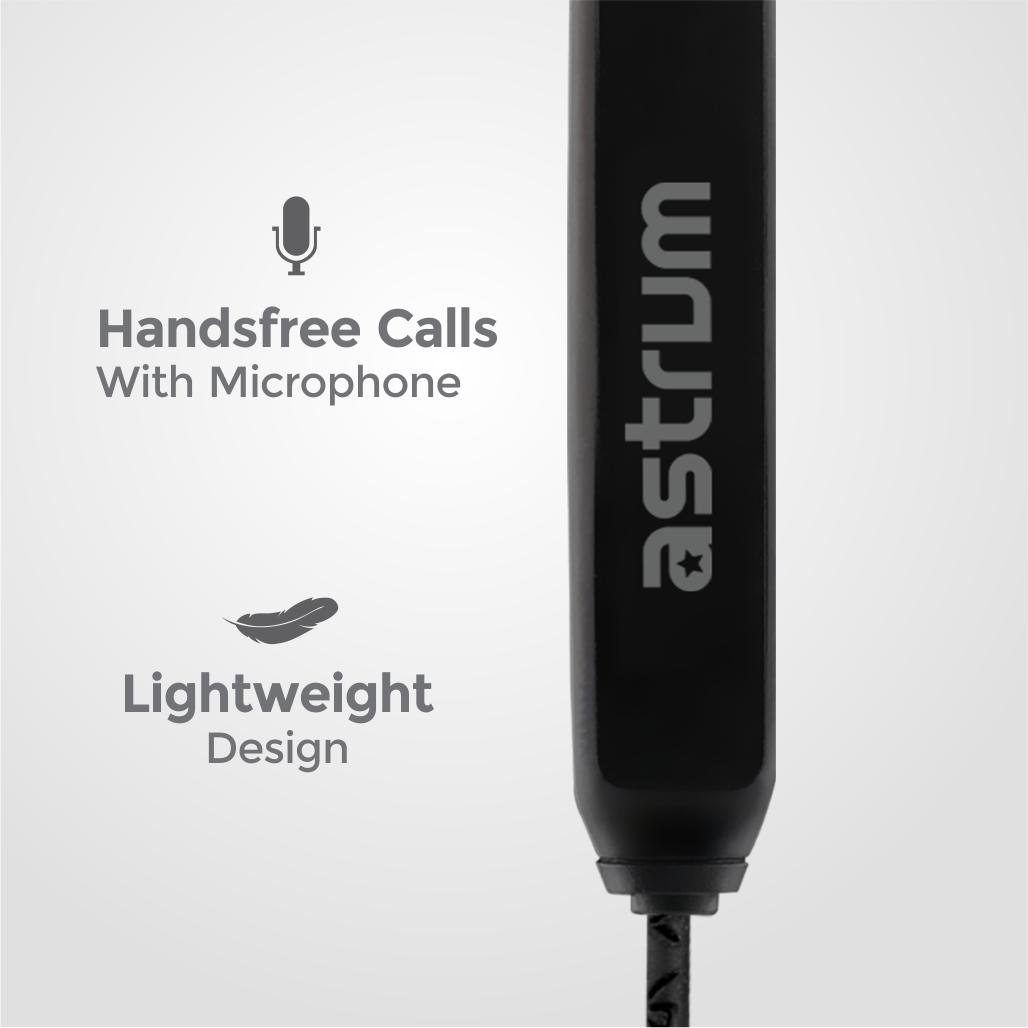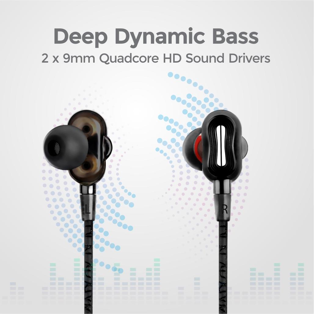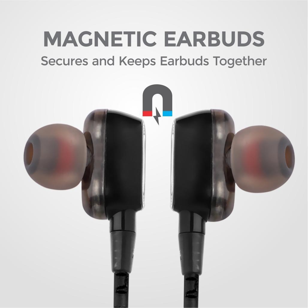 Deep bass Quad drivers magnetic bluetooth wireless earphones with in-built mic for handsfree calls. Upto 8 hours of wireless music and sport activities.