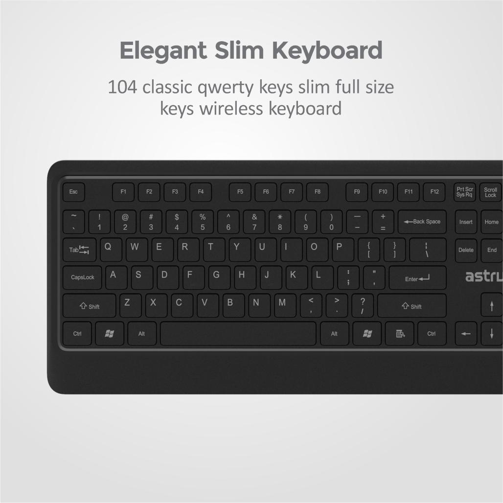 Full size 2.4Ghz slim wireless keyboard and mouse combo, silent 104 keys, spill resistant, qwerty english layout, 4 buttons high precision 1000dpi wireless mouse.