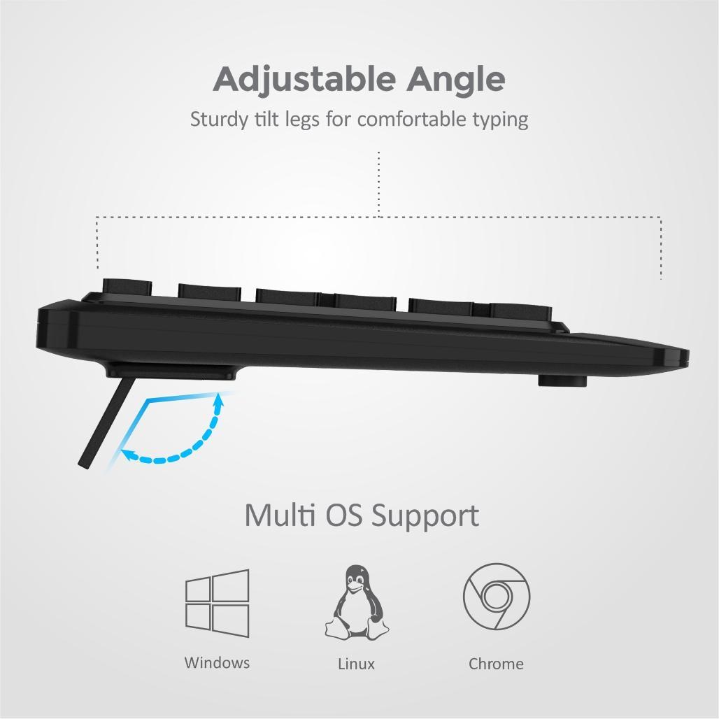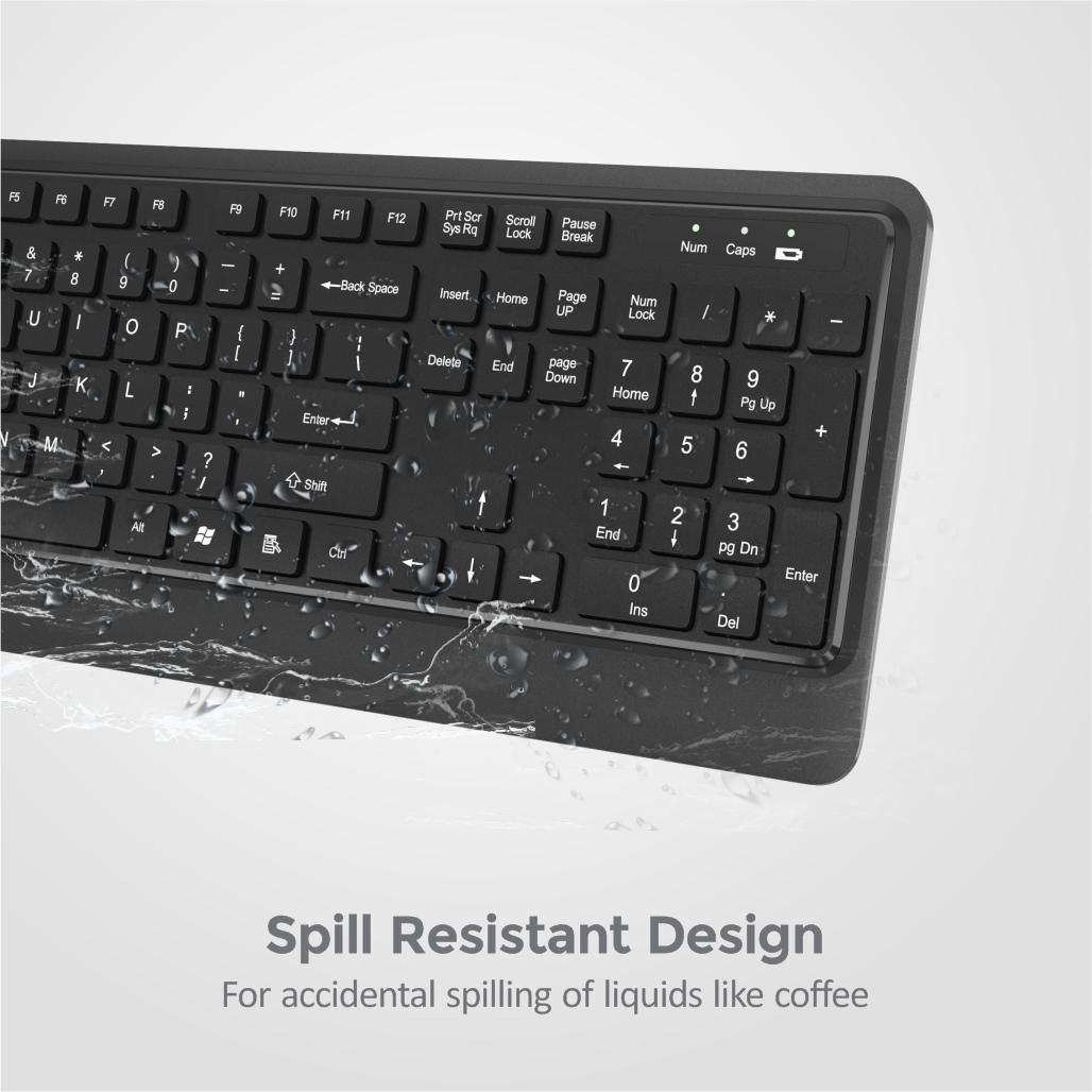 The slim profile full-size Keyboard comes with an ergonomic design, desktop and laptop compatibility, spill-resistant design acting as a shield to protect the keyboard from spillage accidents. Its wireless connectivity, silent keys with boldly engraved keycaps give the touch of comfort and ease without any noise disturbance.