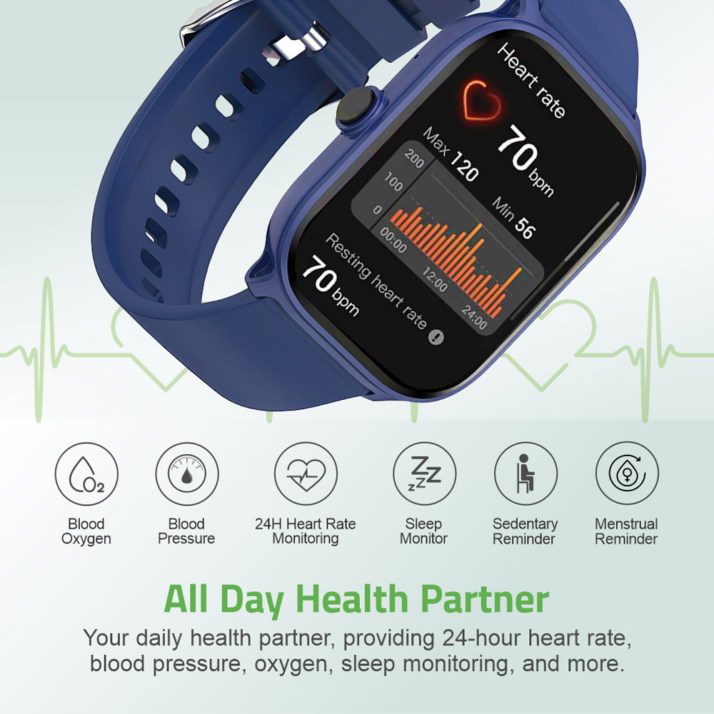 Monitor your health with real-time blood oxygen tracking, blood pressure measurement, stress test and relaxation guidance. The 24-hour heart rate monitor aids in optimizing your training sessions and overall well-being, it also features reminders such as hand washing, drink water, sedentary and menstural (for women) reminders making it a unique all day health partner.