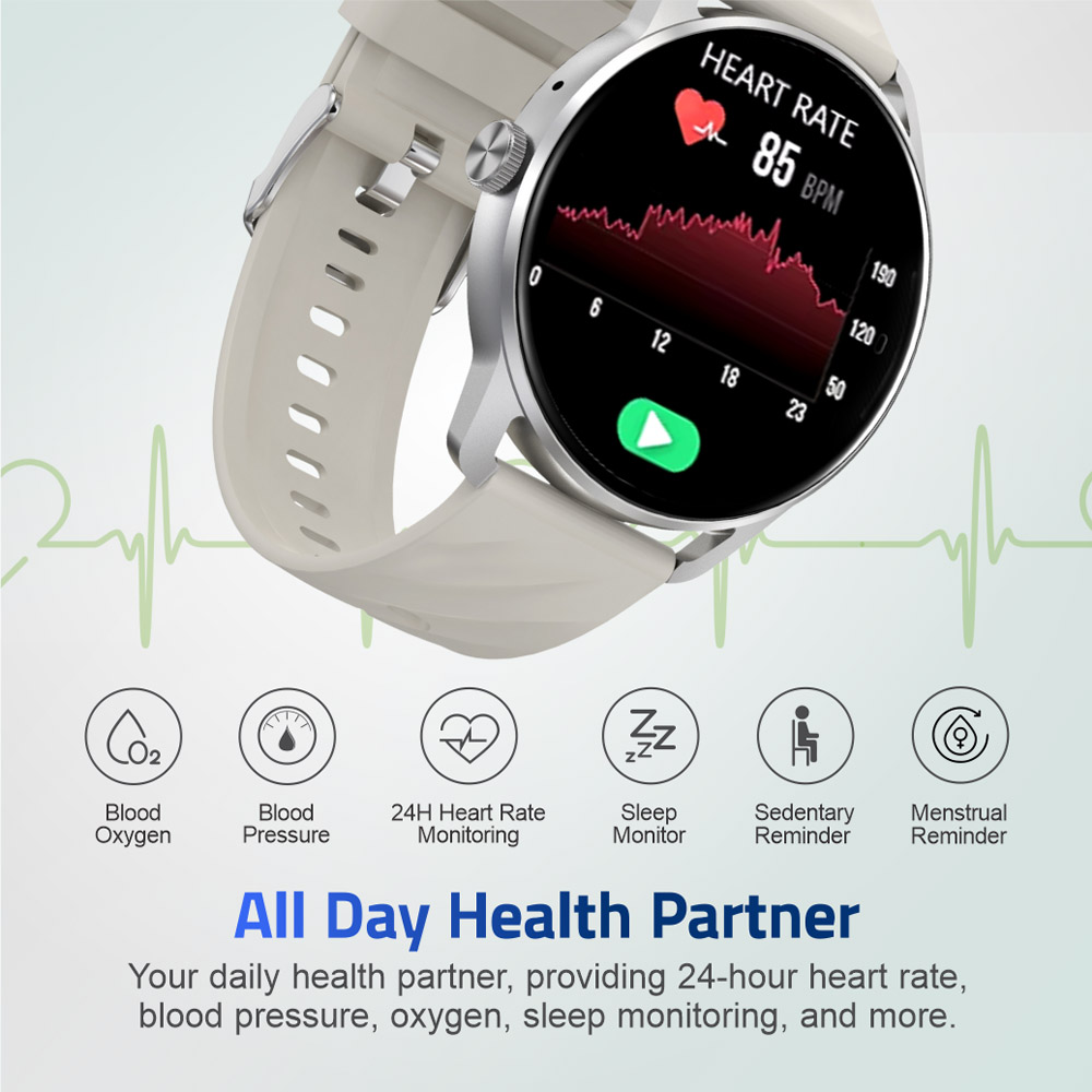 Crafted with precision, the smartwatch boasts an ultra-thin zinc alloy body and a comfortable food-grade silicone strap, suitable for sensitive skin. It provides comprehensive health monitoring features such as real-time blood oxygen tracking, blood pressure measurement, stress testing with relaxation guidance, and 24-hour heart rate monitoring to optimize workouts and well-being.
