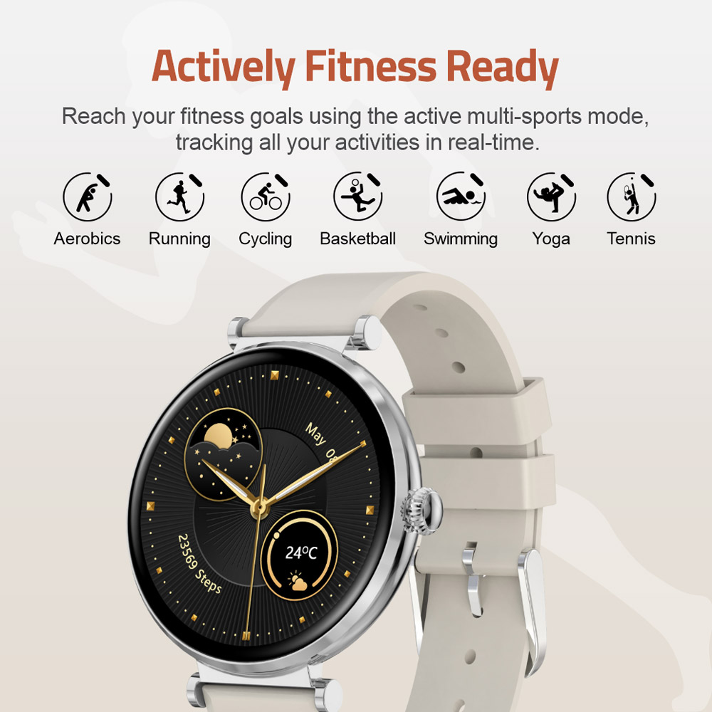 Crafted with precision, the smartwatch boasts an ultra-thin zinc alloy body and a comfortable food-grade silicone strap, suitable for sensitive skin. It provides comprehensive health monitoring features such as real-time blood oxygen tracking, blood pressure measurement, stress testing with relaxation guidance, and 24-hour heart rate monitoring to optimize workouts and well-being.