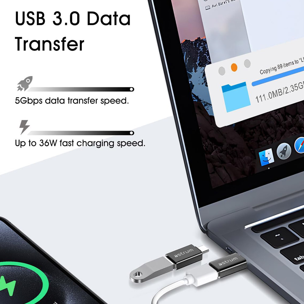 Featuring a compact and refined design that won’t obstruct adjacent ports, these adapters allow for a seamless dual-plug setup, allowing you to effortlessly connect two of them to neighboring USB-C ports. With its steadfast compatibility with the USB 3.0 protocol, you’ll experience a remarkable boost in productivity, effectively doubling your efficiency.