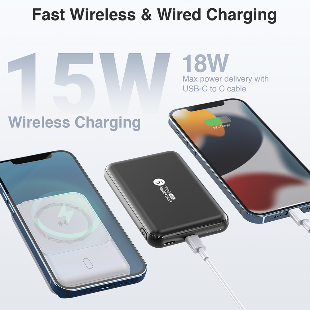 Magnetic induction wireless power bank for the latest iPhone and Android, 15W quick charge, dual USB-C, smart IC.