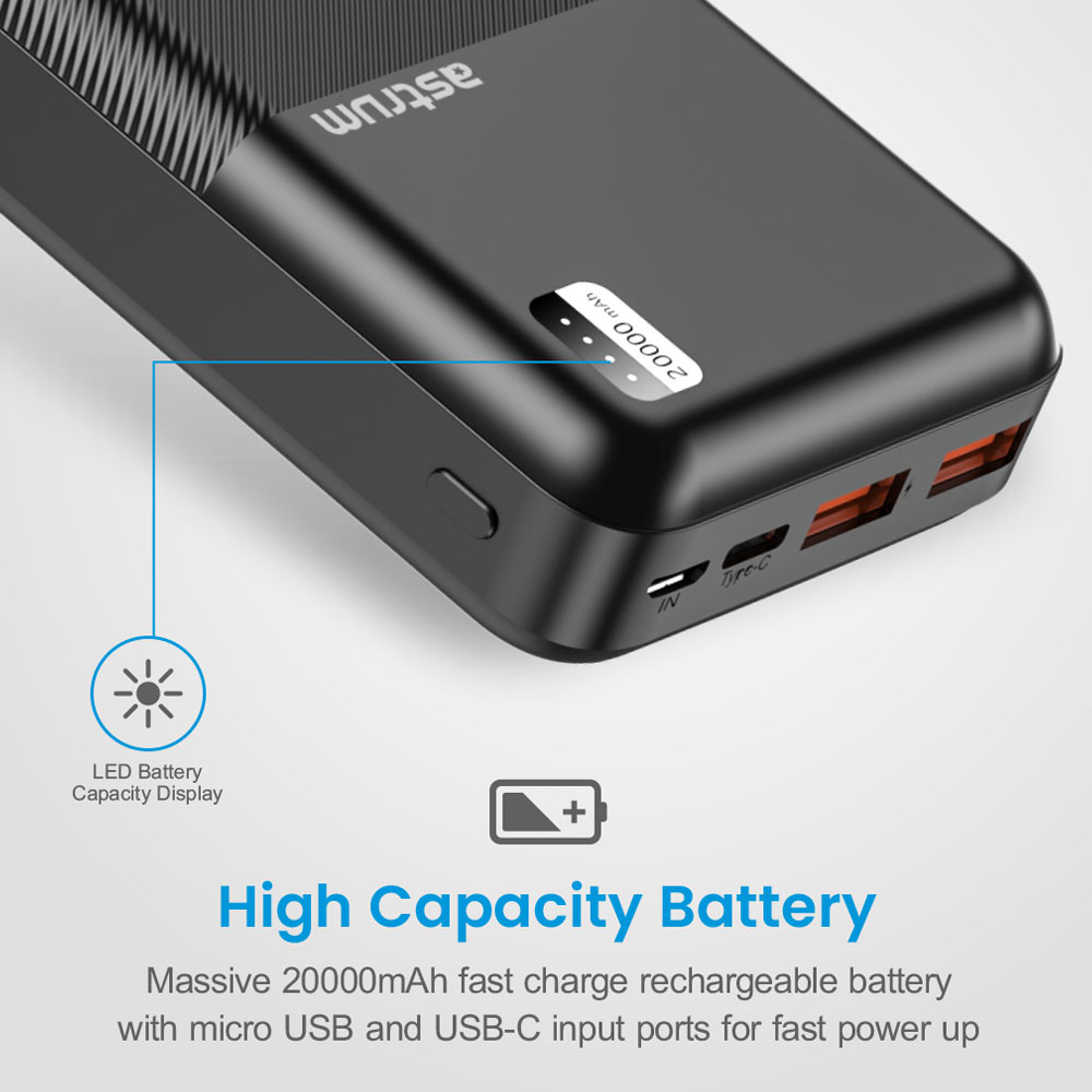 The Fast Charging Ultra-Portable Power Bank is a high-capacity, versatile charging solution designed to keep your smart devices powered up on the go. With a robust 20,000mAh solid battery, dual USB-A ports, and multiple input options, this power bank offers reliable and rapid charging for all your essential electronics.