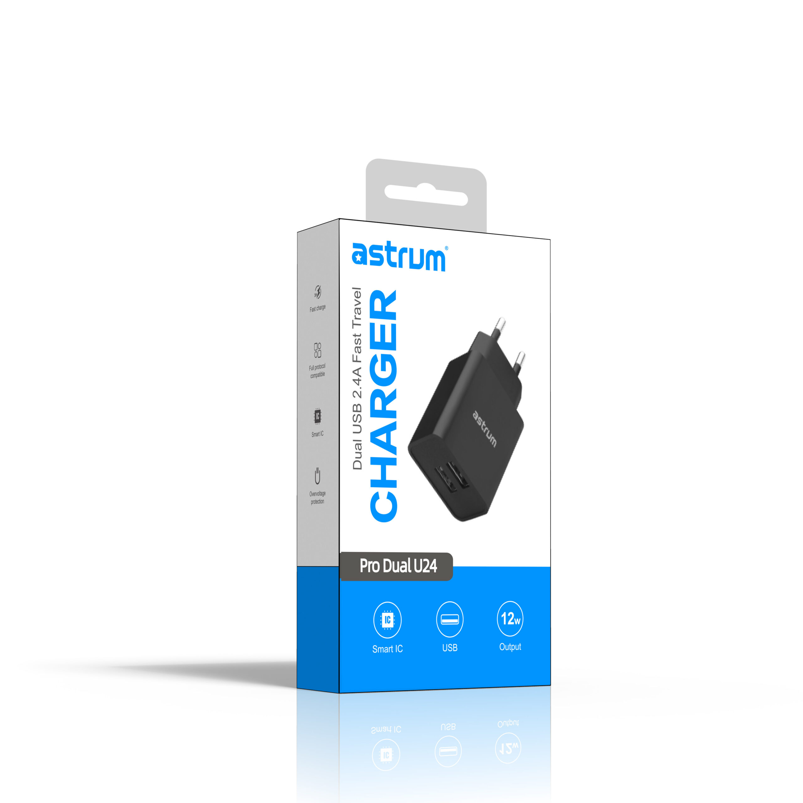 A portable power-up solution, never let your battery run out of power with Astrum Pro Dual U24 fast travel wall charger. Stay connected, make longer calls and watch videos non-stop on your smart mobiles knowing that our premium charger is ever ready to help you charge up your devices when your battery runs low, just plug it into a wall socket outlet and power it up in no time.