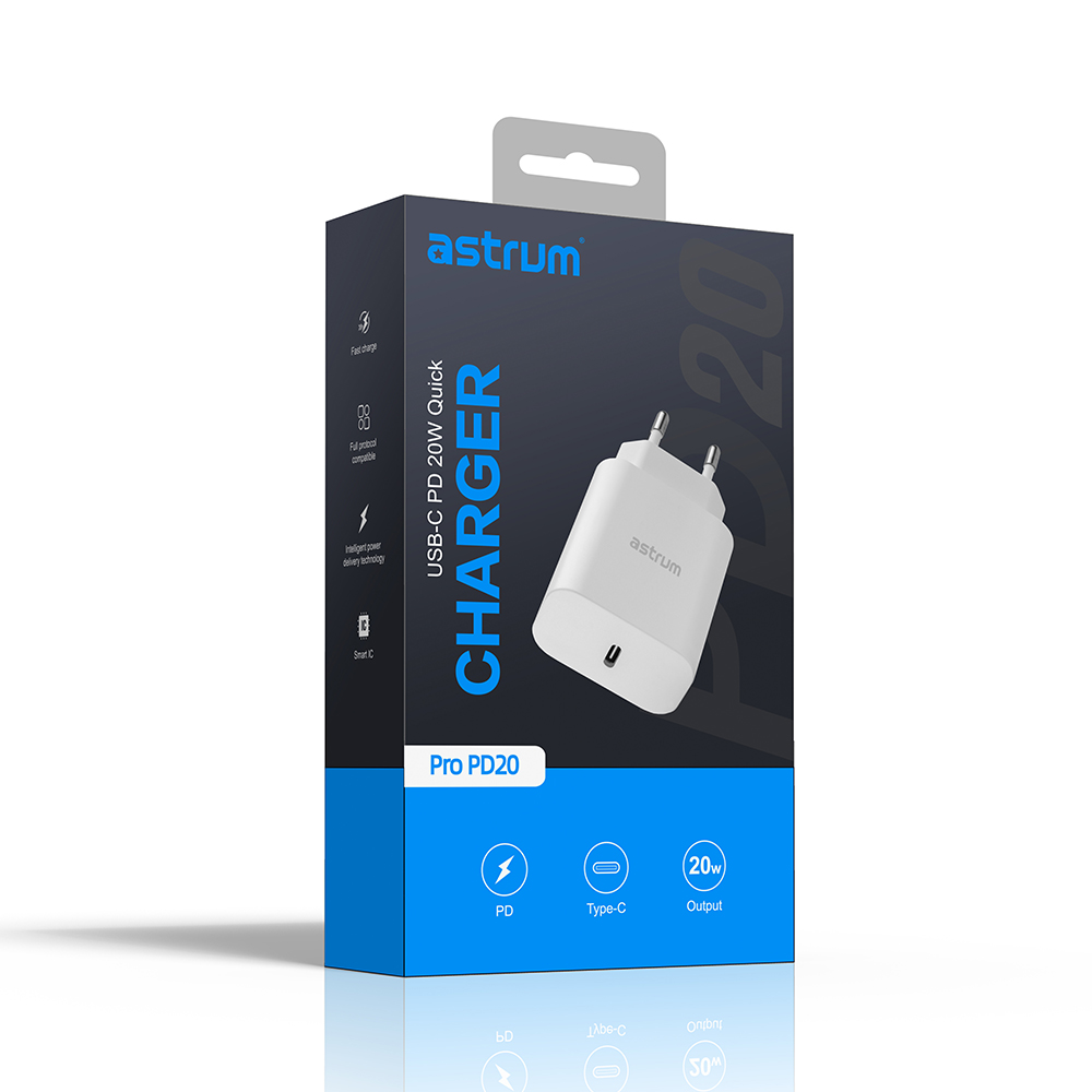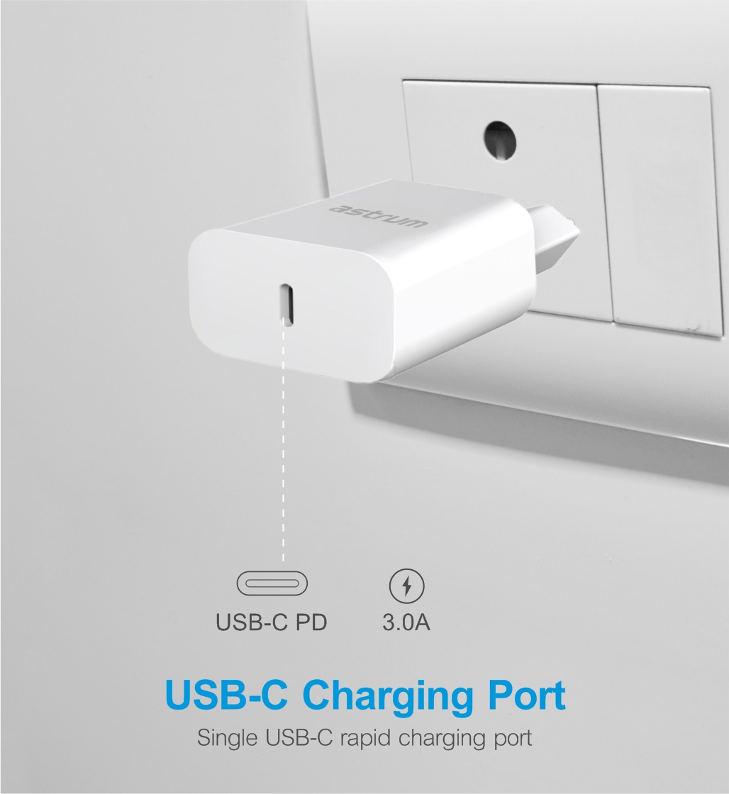 Premium quick charge travel wall charger, ultra-fast PD 20W 3A output, single USB-C port and inbuilt smart IC.