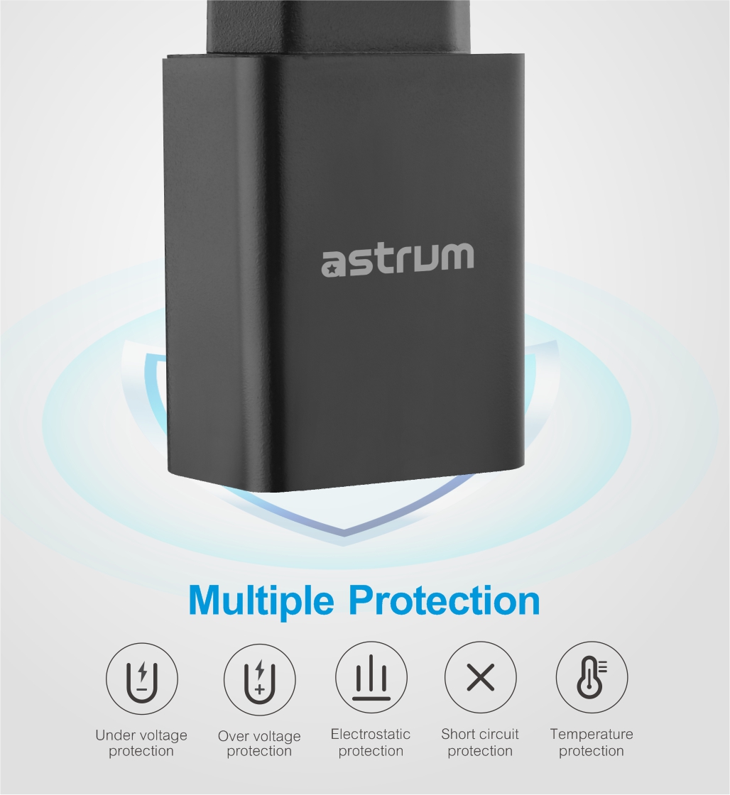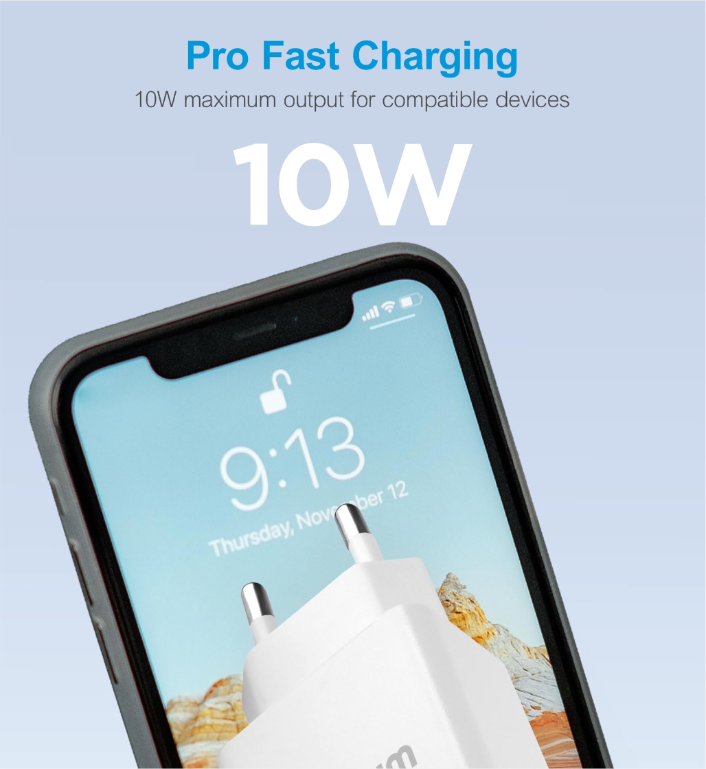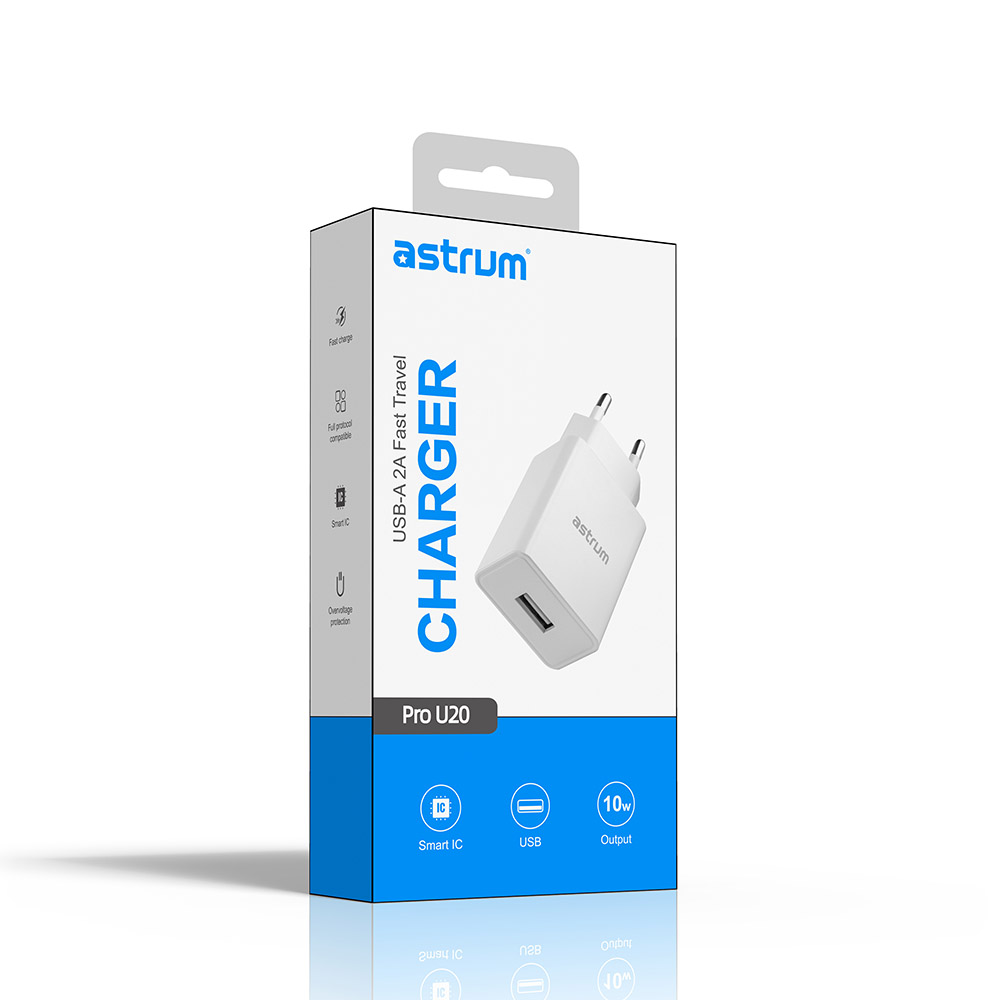 A portable power-up solution never let your battery run out of power with Astrum Pro U20 10W 2A single USB wall charger. Stay connected, make longer calls and watch videos non-stop on your smart mobiles knowing that our premium charger is ever ready to help you charge up your devices when your battery runs low, just plug it into a wall socket outlet and power it up in no time.