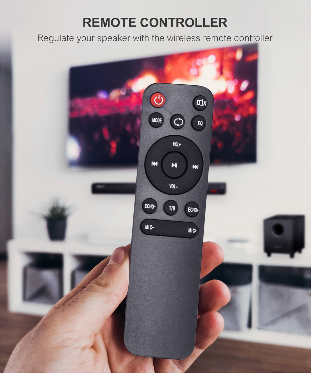 Control and regulate your listening with a fully functional wireless remote controller with power on/off, volume control, track selection, play/pause, mode, echo, and mic buttons, helping you adjust your speaker to suit your listening needs.