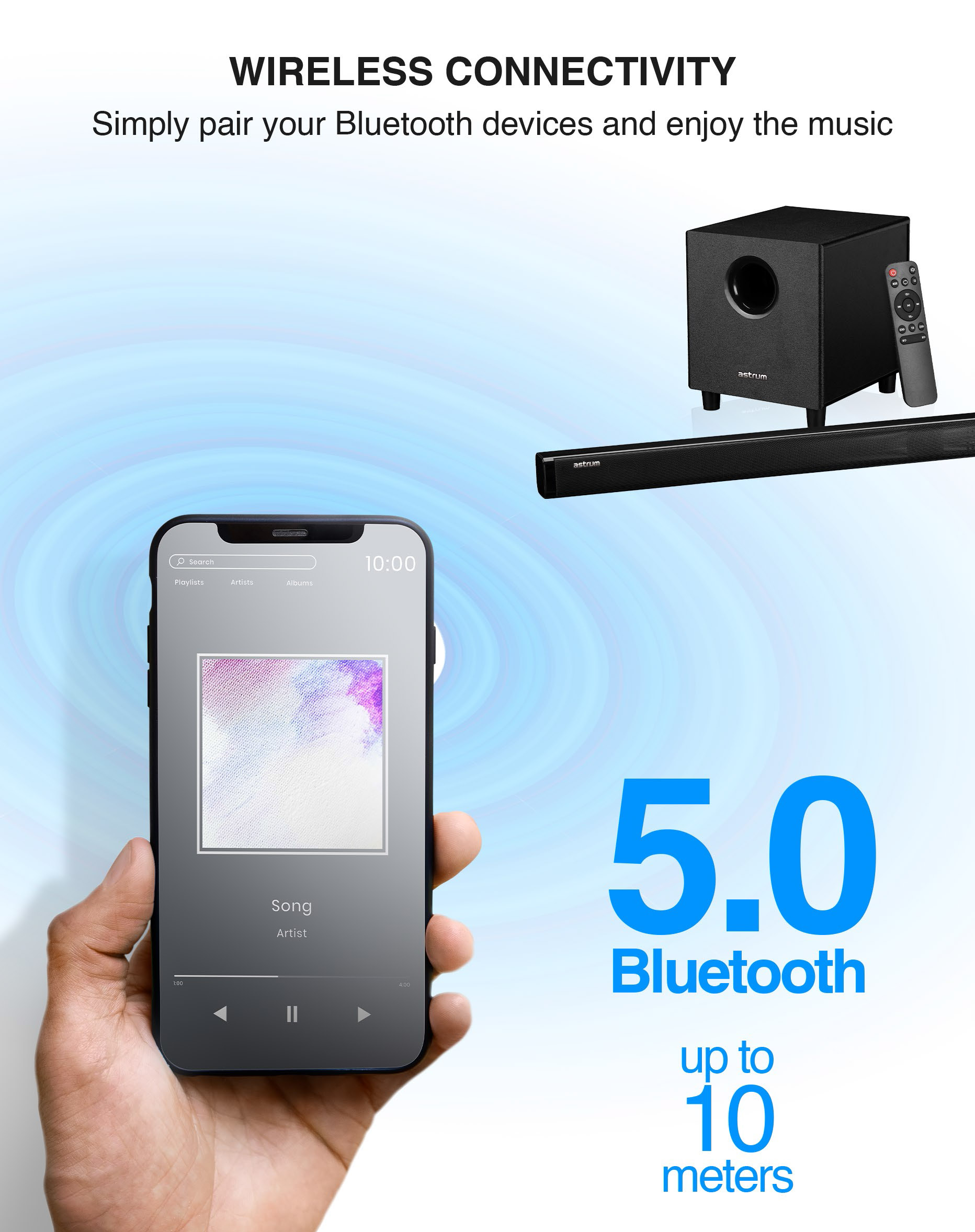 Get transferred into the heart of the action with Astrum SM310’s powerful wireless 2.1CH Soundbar, boasting an impressive 70W total RMS output power. Experience deep, detailed sound with the powerful subwoofer which delivers rich, clear stereo sound. The 3D surround sound offers a breathtaking level of realism, for a truly cinematic experience.