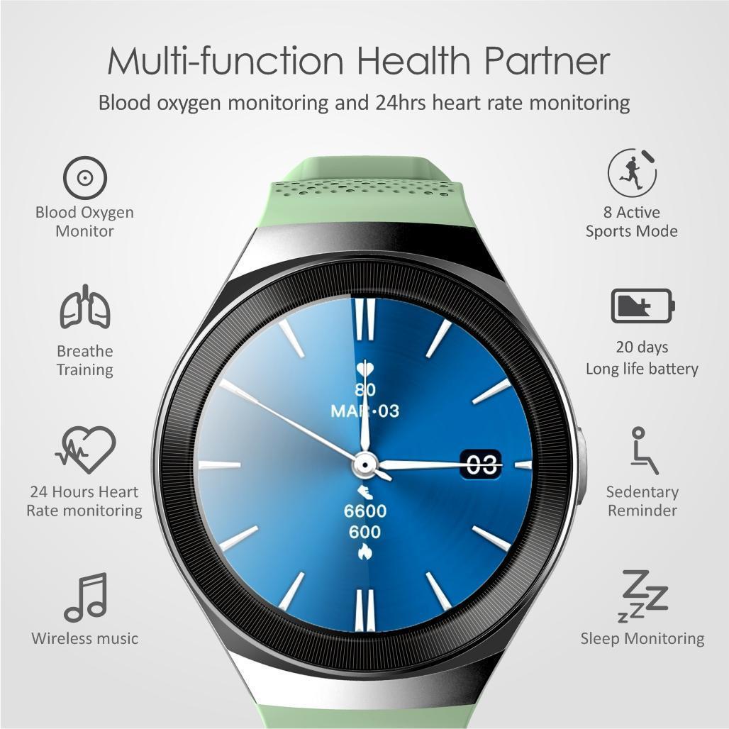 An innovative modern bluetooth calling smartwatch for all active and health conscious people, featuring an IPS round full HD touch screen, and an elegant interchangeable food grade silicone strap suited for those with sensitive and delicate skin.