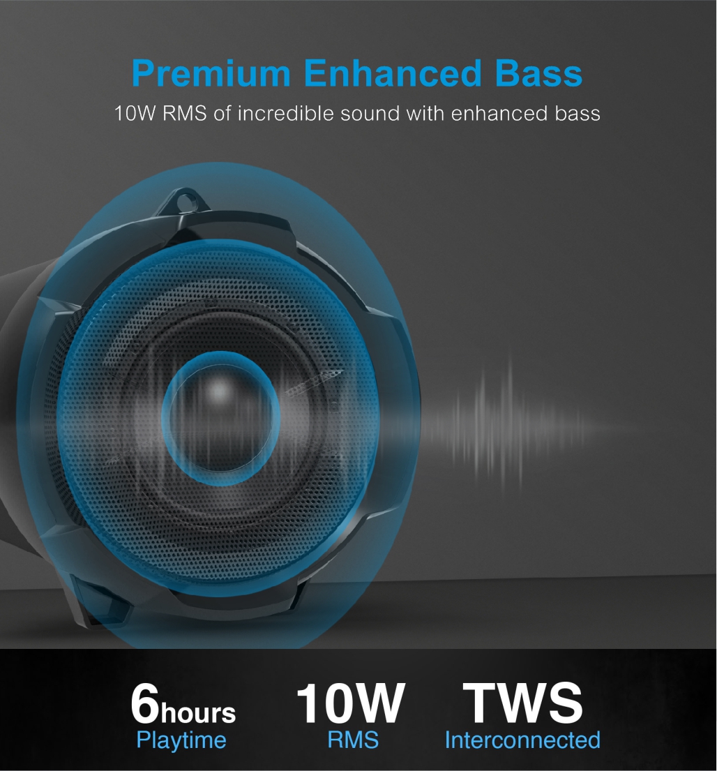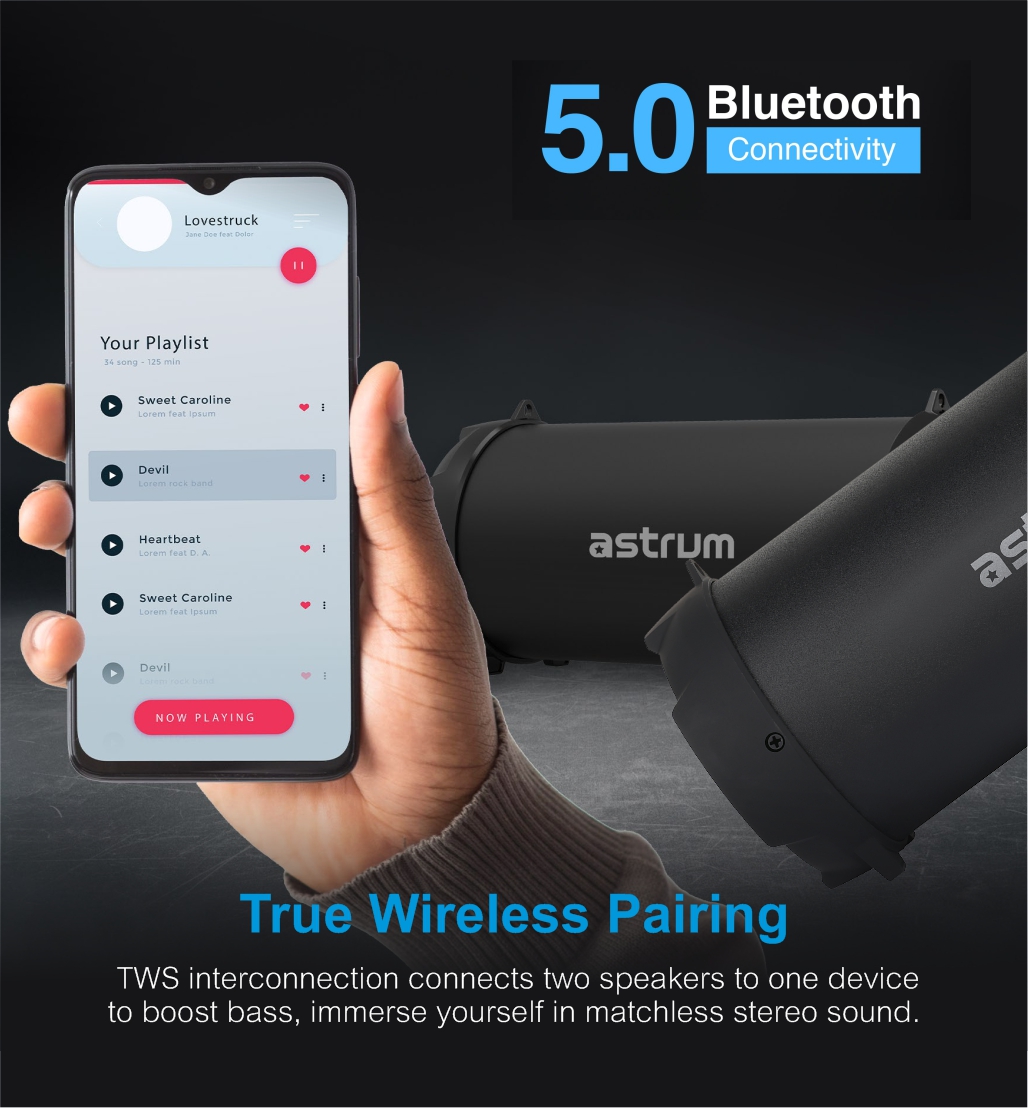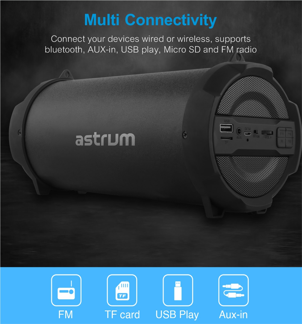 True wireless multifunction round barrel speaker supports stereo interconnection aux-in USB, TF card, bluetooth and FM. Enjoy upto 6 hours non-stop music.
