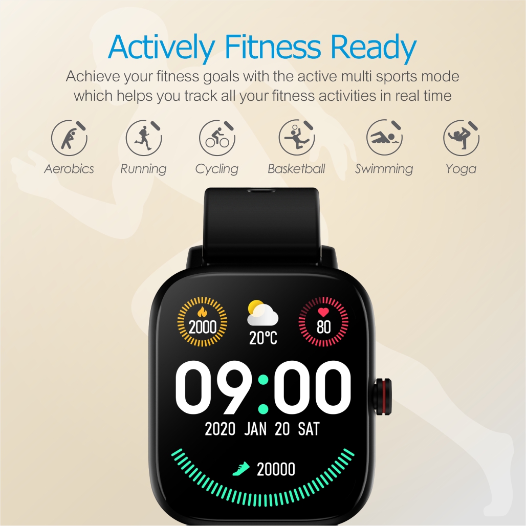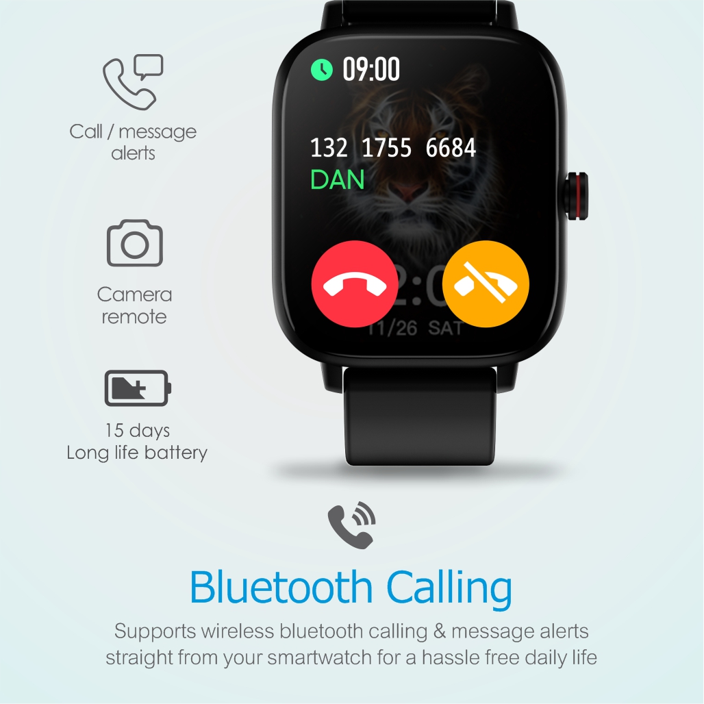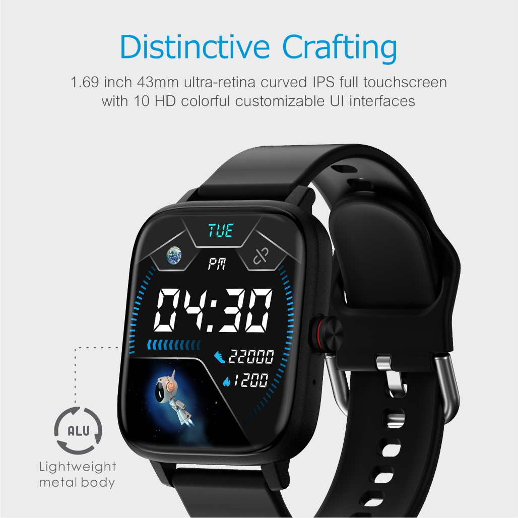 1.69″ touchscreen smart fitness watch, upto 15 days battery life, BT call, Multi-function, and 10 sport modes.