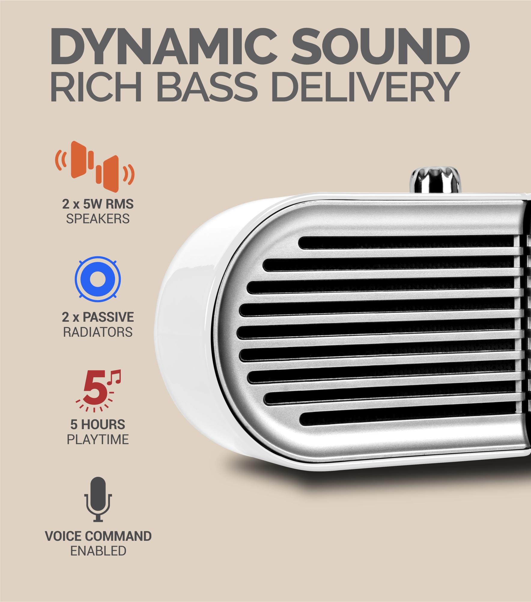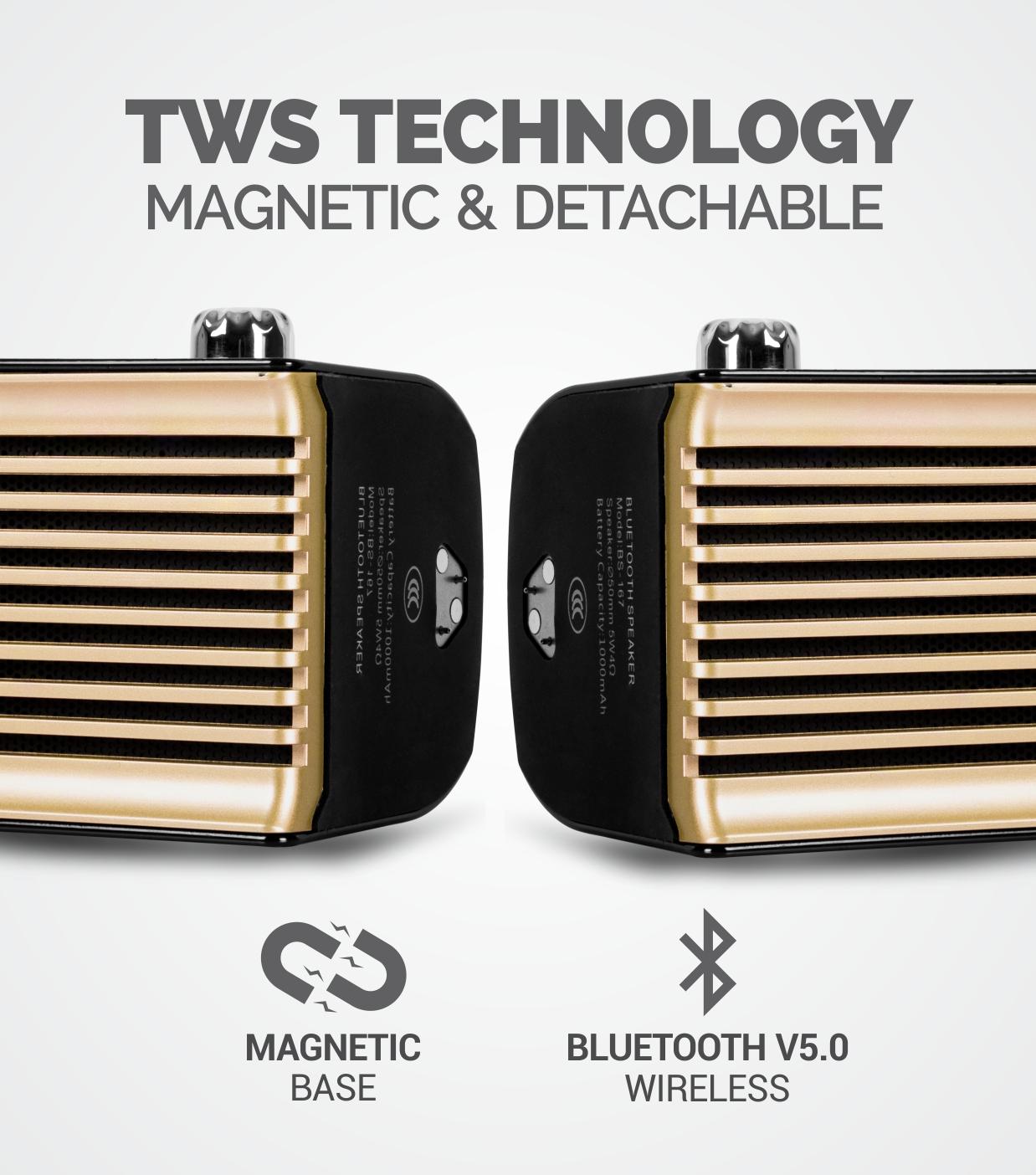Wireless portable detachable speakers with TWS magnetic base, classic piano retro profile, 2 x 5W RMS, 2 passive radiators & voice command for indoor and outdoor use.