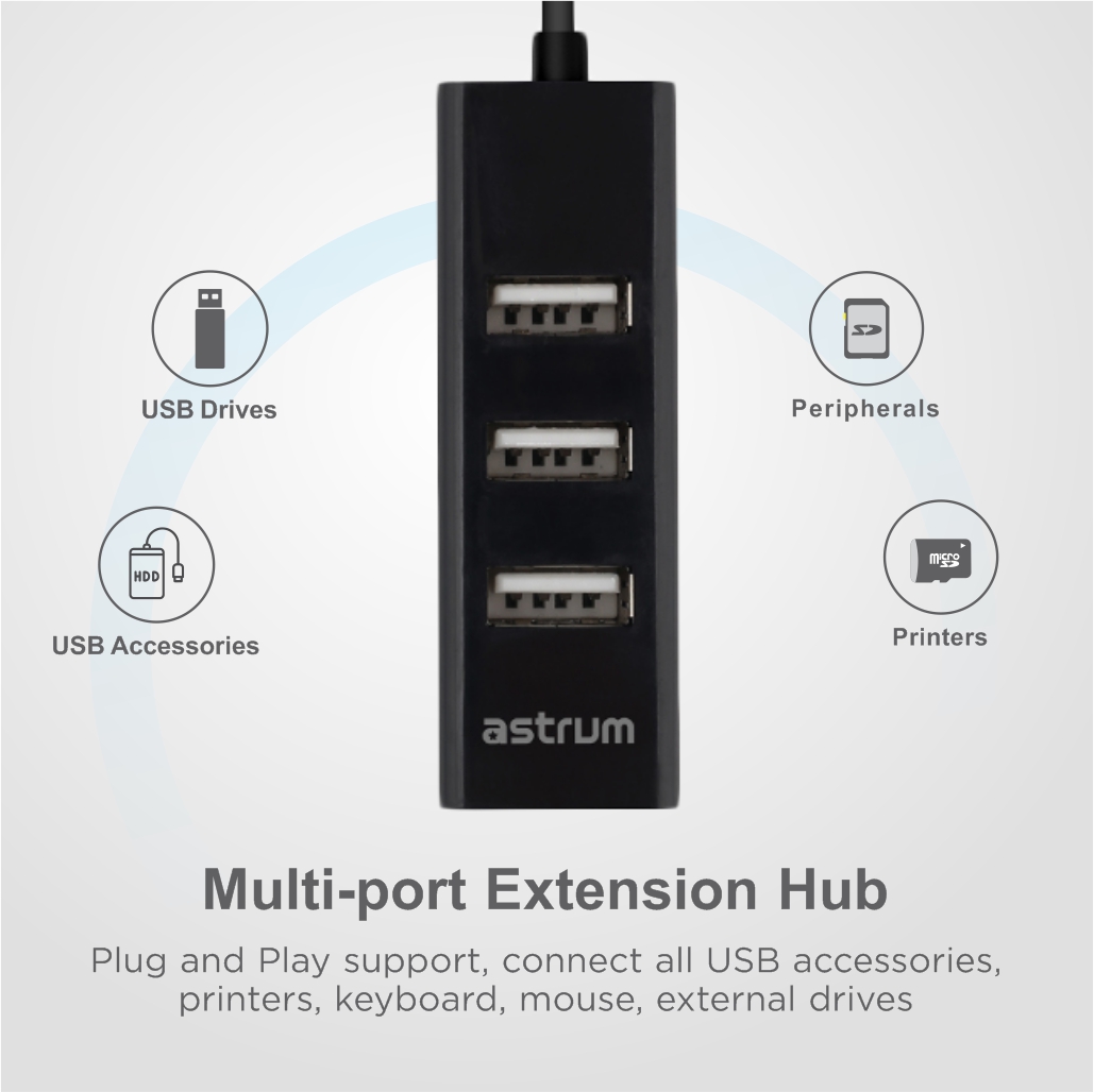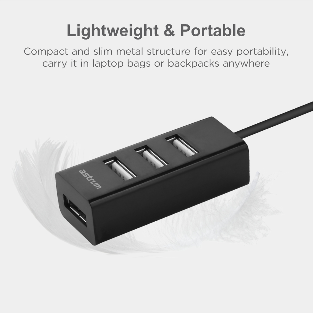 This compact and slim Astrum UH050 4 ports hub is your ideal work helper during business trips. Take your USB multiport hub with you wherever you go. Lightweight, compact travel format, easy to carry in laptop bags or backpacks.