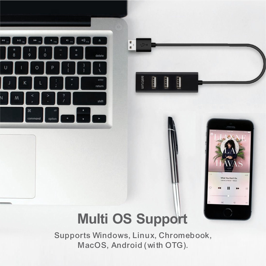 Slim portable 4 ports USB hub tranfer files and data in full speeds of upto up to 480mbps, USB plug and play with USB extension cable.