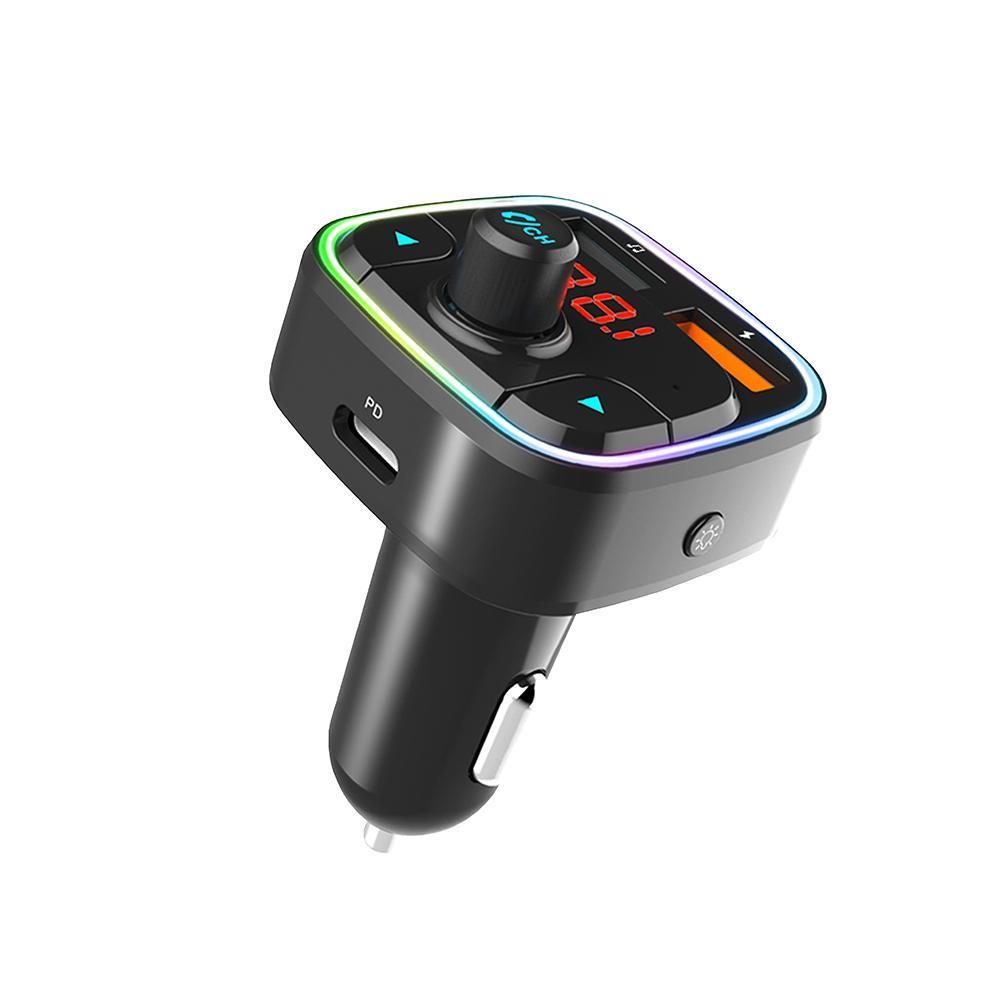 In-Car wireless bluetooth FM transmitter with Mic for calls, 18W USB-C PD charging, smart siri & 7 colors LED Light.